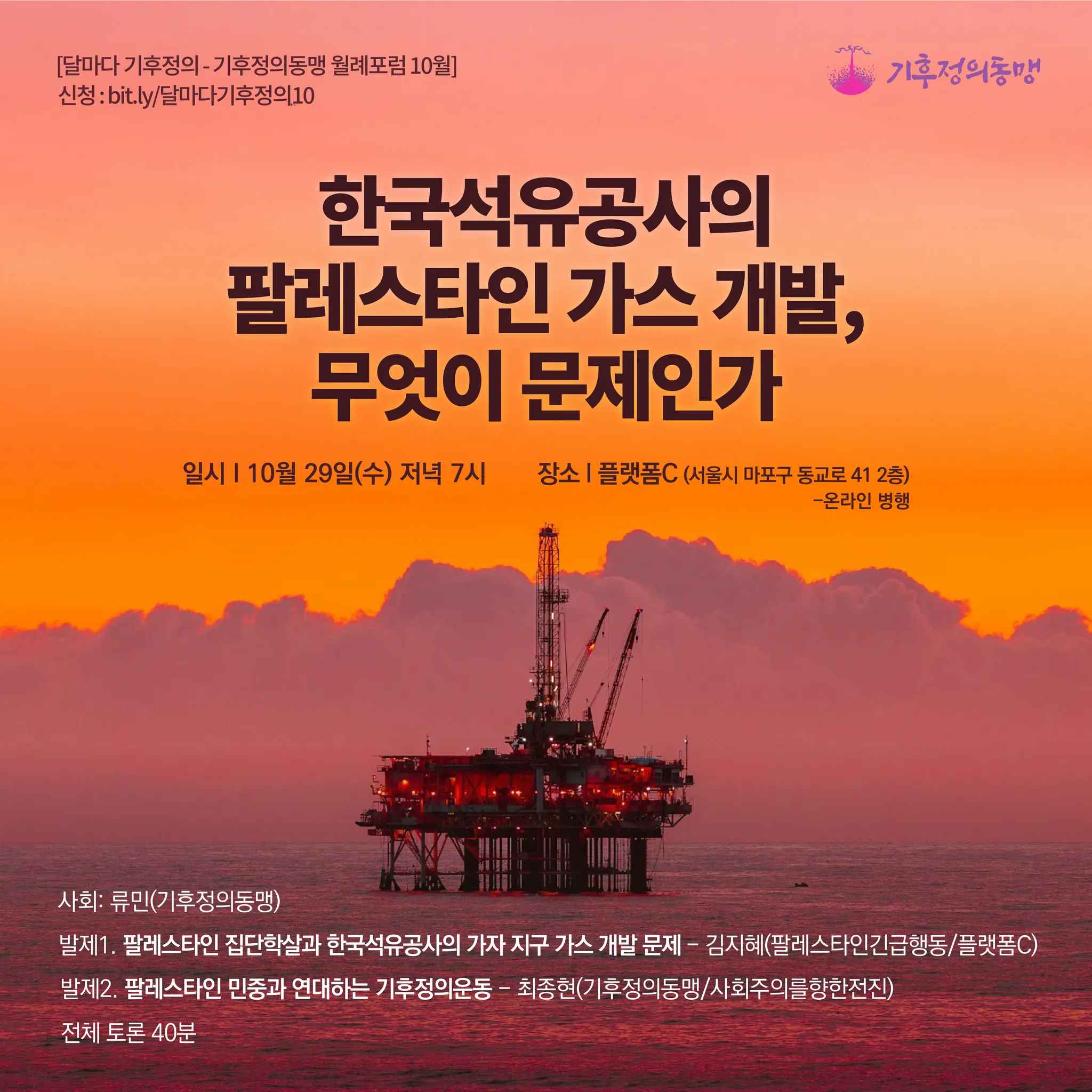 기후위기는 자본의 이익을 위해 산과 들, 갯벌과 바다 온 세상을 채굴하며 오늘날에 도달했습니다. 여기에는 더 풍요로운 자원이 매장된 땅을 빼앗기 위해 침략과 강제점령을 반복해온 제국주의 역사가 중첩됩니다. 공기업인 한국석유공사가 팔레스타인 가자지구 해역의 강탈과 생태파괴에 어떻게 연루되어 있는지, 기후정의운동은 무엇으로 맞설 것인지 함께 고민해봅시다. 많은 참여 부탁드립니다.