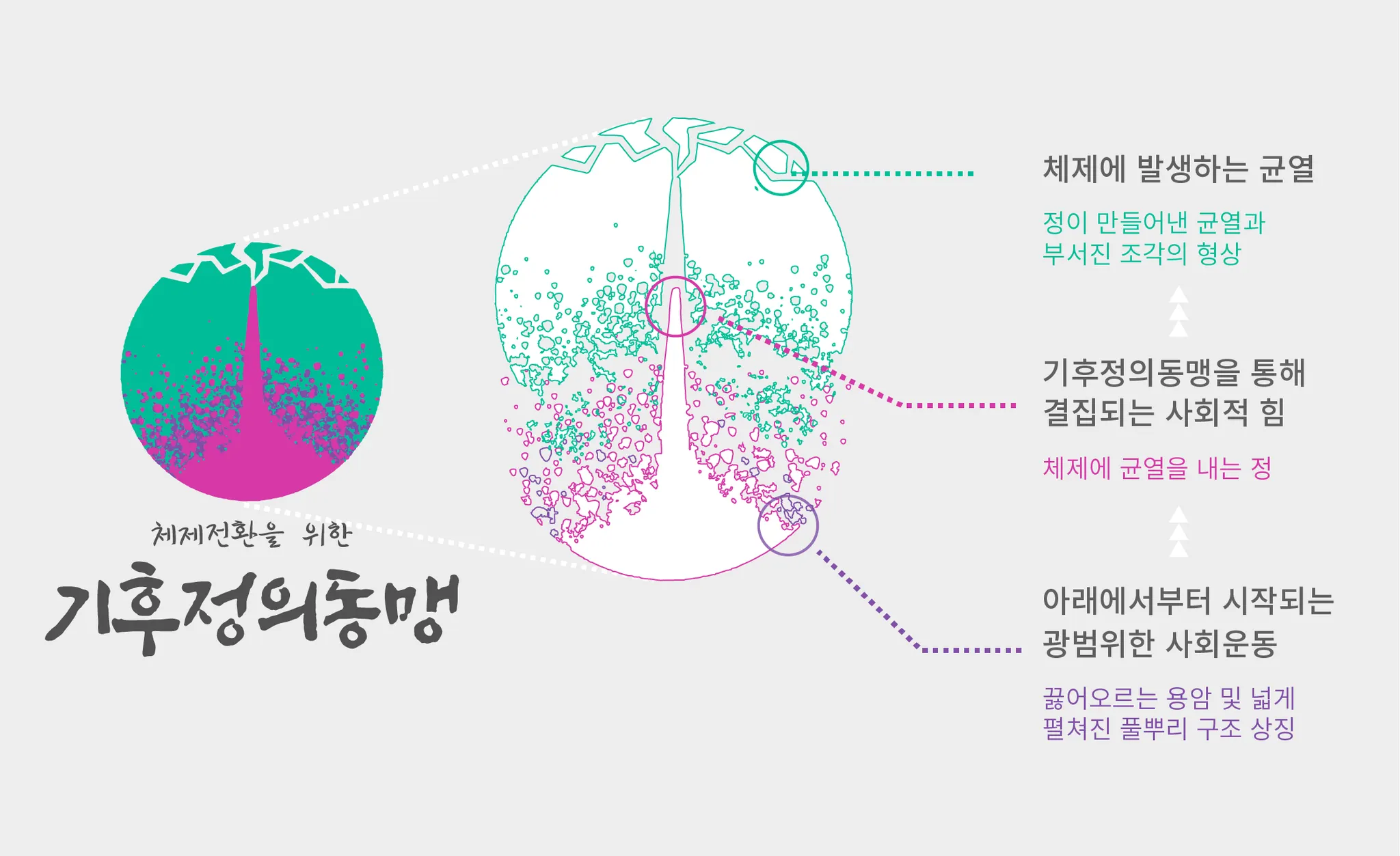 송곳같이 솟아오르는 붉은 기운은 체제에 균열을 내는 정을 의미합니다. 아래에서부터 시작하는 노동자, 농민, 최일선 당사자들의 연대를 통한 광범위한 사회운동이 기후정의동맹을 통해 사회적 힘으로 결집하여 지금의 불평등한 세계에 큰 균열을 만들어낼 것입니다. '기후위기를 겪는 세계'에서 평등하고 존엄한 삶을 살아가기 위한 투쟁으로 다른 세계를 열어봅시다. 우리의 힘으로 !