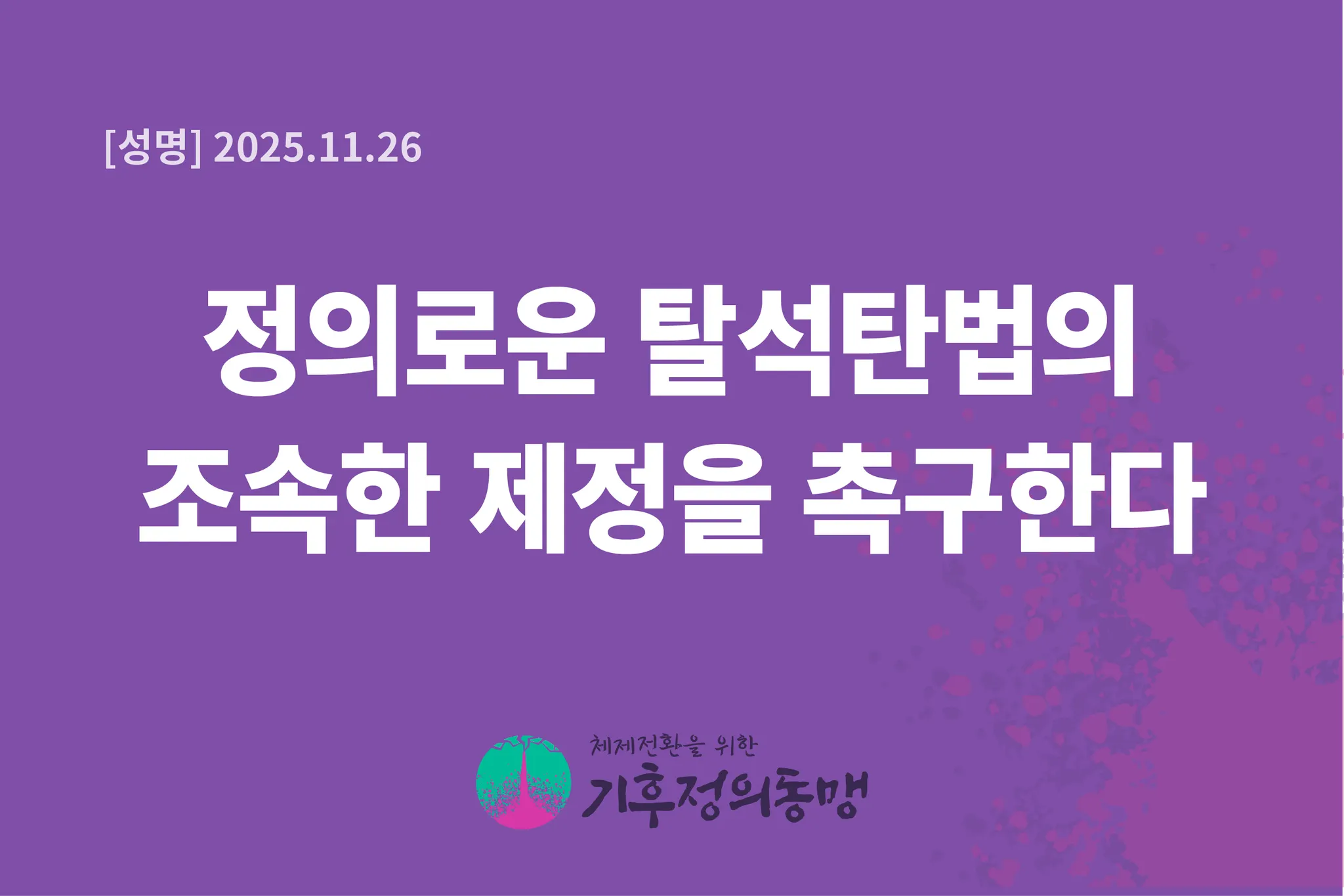 11월 26일, 탈석탄법 제정연대가 성안한 ‘정의로운 탈석탄법(안)’((석탄화력발전 중단과 정의로운 전환에 관한 특별법안)이 국회에 발의되었다. 이 법안에는 기후위기 대응을 위한 조속한 석탄발전소 폐쇄와 발전노동자들의 총고용 보장 조항이 나란히 담겨져 있다. 이로서 석탄발전소의 정의로운 전환에 필요한 법적 기반을 만드는데 한 걸음 나아갈 수 있게 되었다. 탈석탄법 제정연대에 참여하면서 법안 성안 과정에 함께 해온 기후정의동맹은 이 법안의 발의를 반갑게 생각한다. 특히, 태안 1호기를 시작으로 석탄발전소의 연속속 폐쇄를 앞두고 시점에서, 발전노동자들의 정의로운 전환에 대한 구체적인 방안이 담겨져 있어서 긍정적으로 평가한다. 국회가 정의로운 탈석탄법안을 조속히 통과시킬 것을 촉구한다.